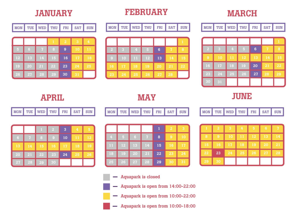 During Estonian national holidays, summer months June-August and school holidays in Estonia, Finland and Latvia Atlantis H2O Aquapark is open every day from 10:00.