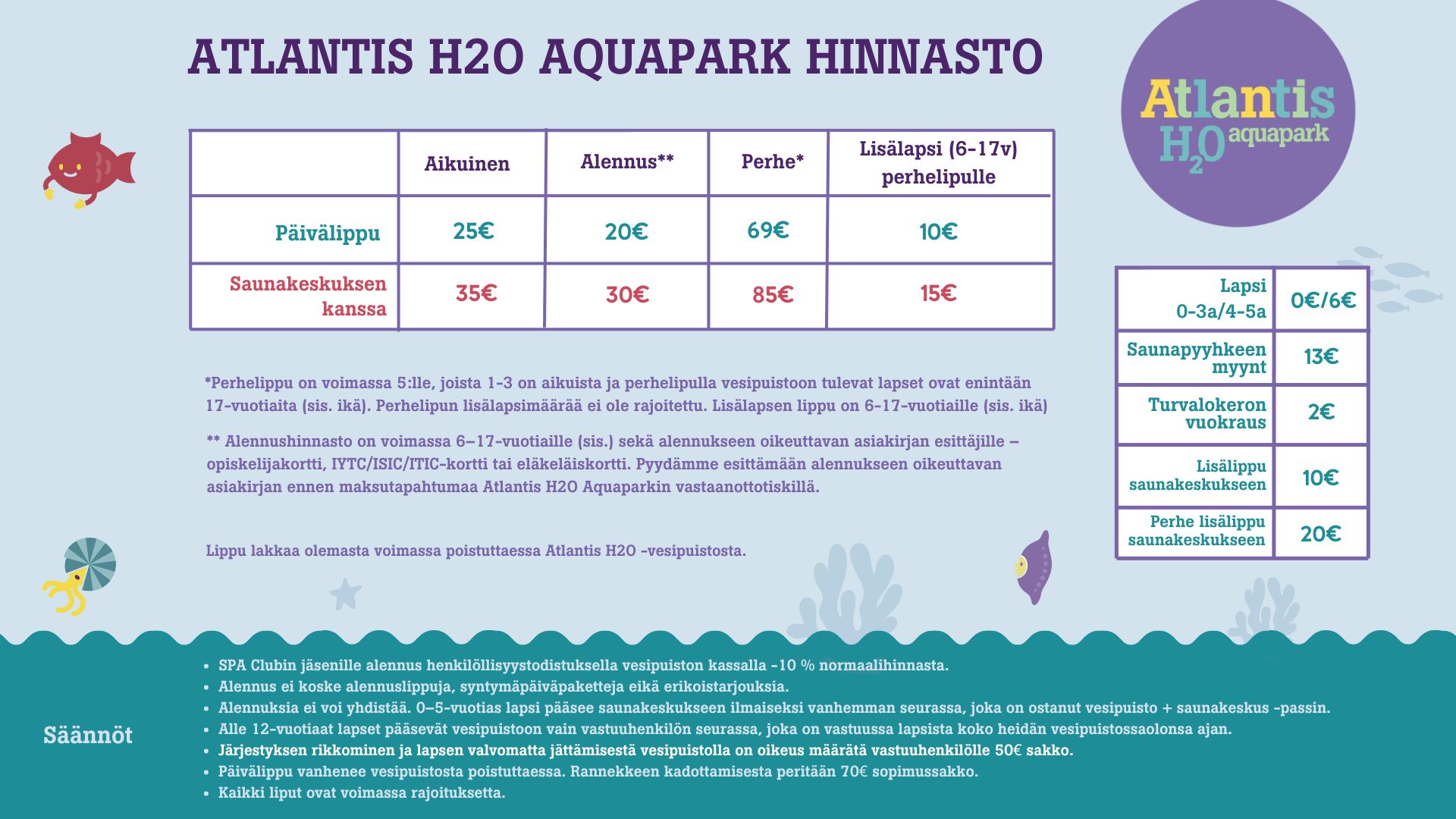 *Perhelippu on voimassa 5:lle, joista 1-3 on aikuista ja perhelipulla vesipuistoon tulevat lapset ovat enintään 17-vuotiaita (sis. ikä). Perhelipun lisälapsimäärää ei ole rajoitettu. Perhen seuraava lapsi on voimassa 6-17-vuotiaille (sis. ikä), määrää ei ole rajoitettu.