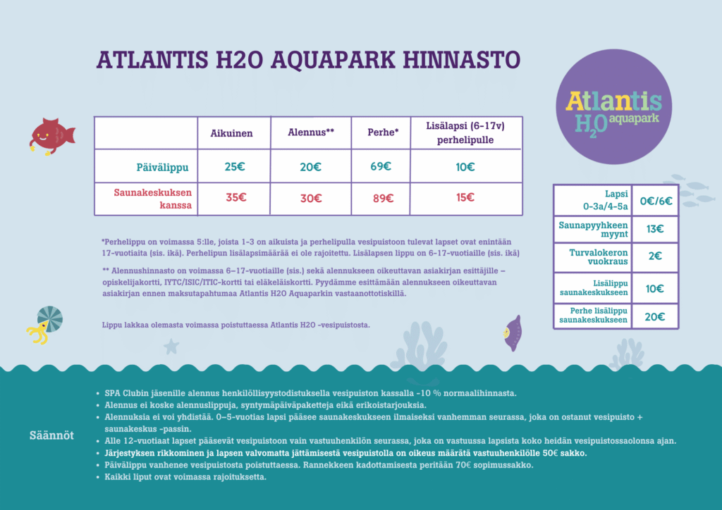 - Viimsi SPA hotellin asiakaille tarjous -rajoittamaton vierailu Atlantis H20 Aquapark vesipuistossa erikoishinnalla 15 €/hlö ja 35 €/perhe. Tarjous on voimassa ajanjaksolla, jolloin asiakas on kirjoittautunut hotelliin. Perhelippu on kahdelle aikuiselle ja kahdelle 15-v. tai sitä nuoremmalle lapselle. 5-vuotiaat ja sitä nuoremmat lapset pääsevät vesipuistoon ilmaiseksi pääsylipun lunastaneen aikuisen seurassa.