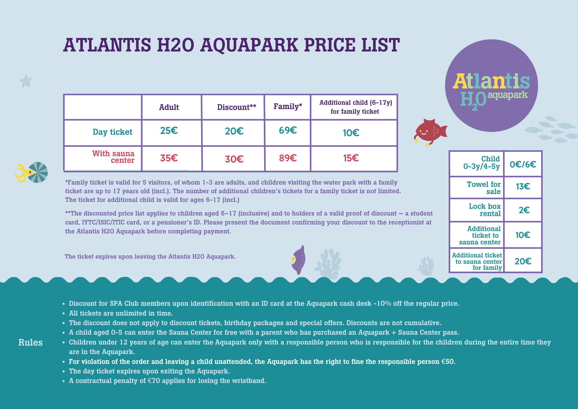 *Ģimenes biļete ir derīga 5 apmeklētājiem, no kuriem 1–3 ir pieaugušie. Bērni, kas apmeklē ūdensparku ar ģimenes biļeti, ir līdz 17 gadu vecumam (ieskaitot). Papildu bērnu biļešu skaits (vecumā no 6 līdz 17 gadiem, ieskaitot) ģimenes biļetei nav ierobežots.