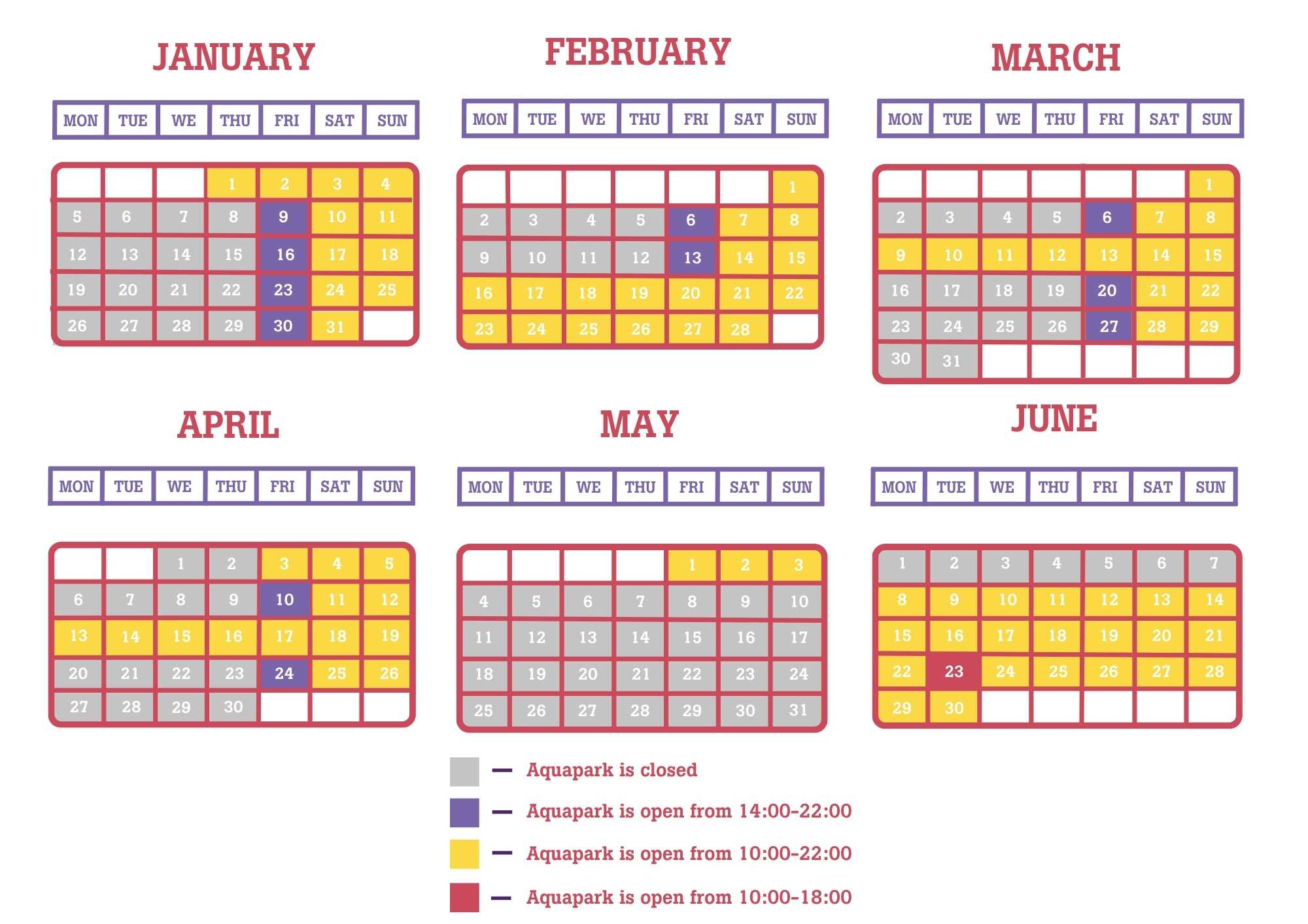 Igaunijas valsts svētkos, vasaras mēnešos (jūnijā-augustā) un skolēnu brīvlaikā Igaunijā, Somijā un Latvijā Atlantis H2O Akvaparks ir atvērts katru dienu no pulksten 10:00.