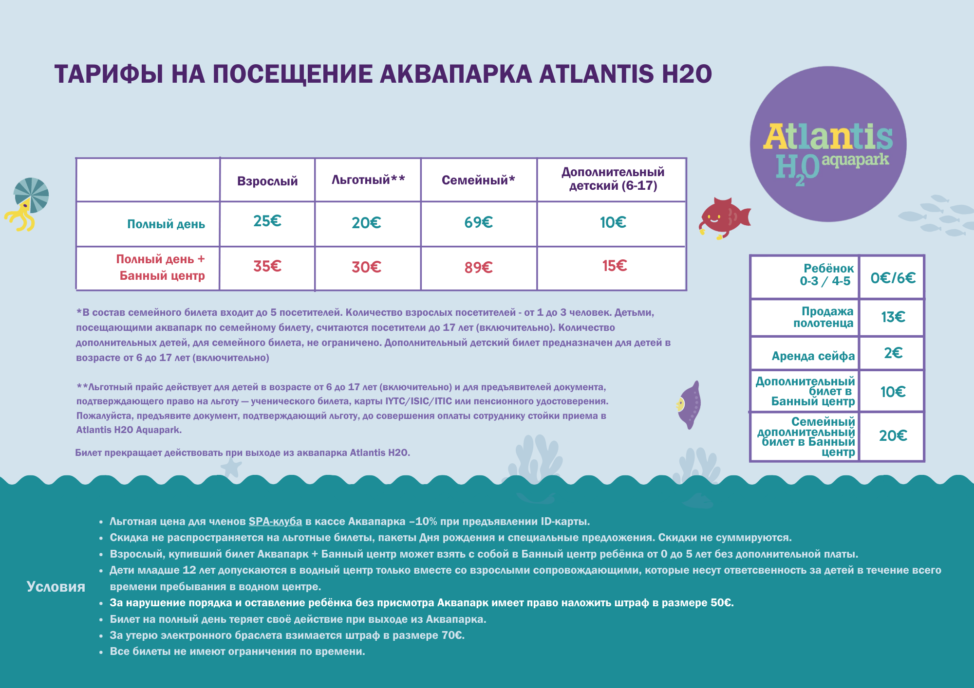 Льготная цена не распространяется на пакеты Дня рождения и специальные предложения. - Специальное предложение Аквапарка Atlantis H20 для проживающих в отеле Viimsi SPA гостей — посещение Аквапарка Atlantis H2O без ограничений 15 €/человек (с 6 лет) и 35 €/семья.