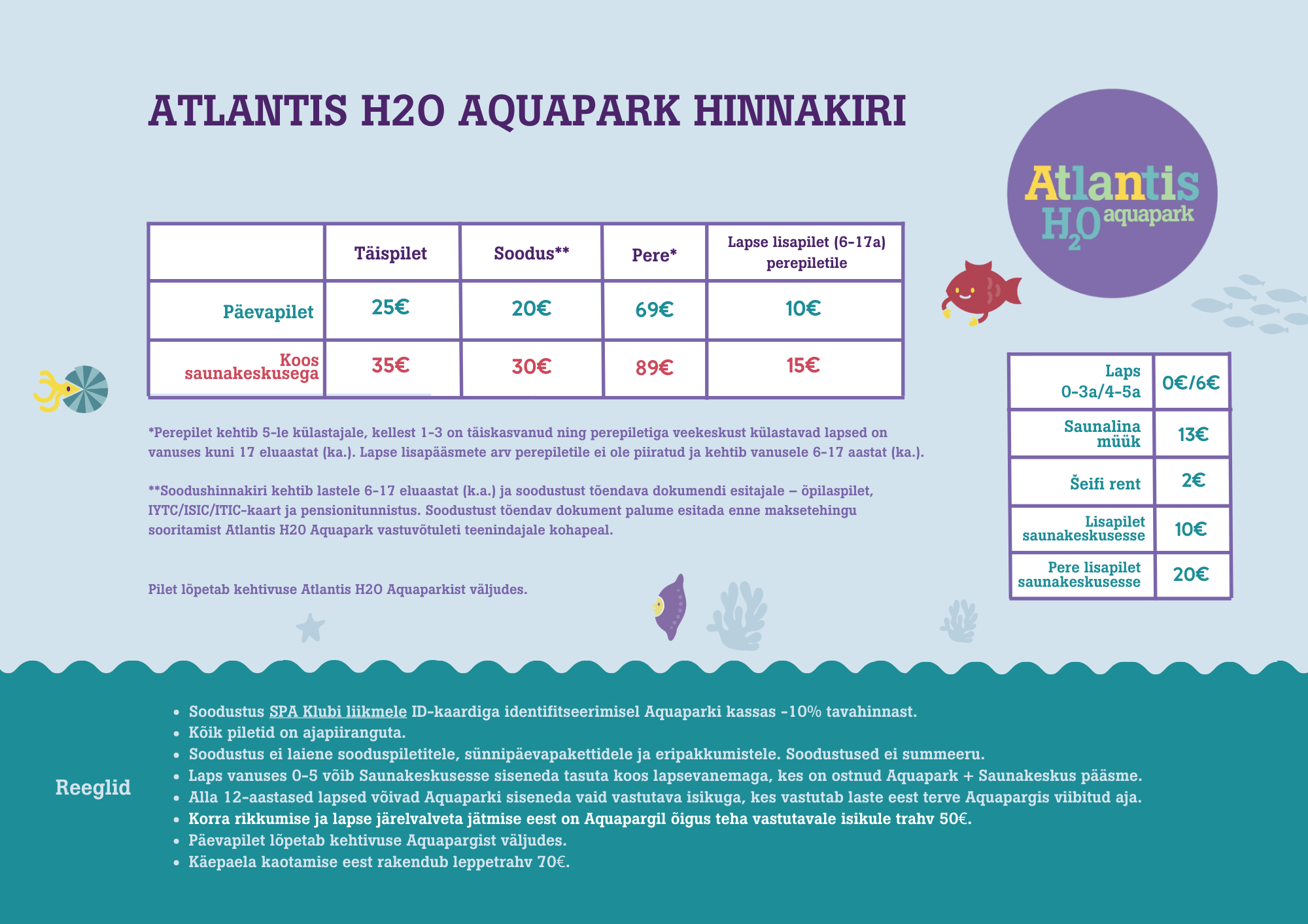 *Perepilet kehtib 5-le külastajale, kellest 1-3 on täiskasvanud ning perepiletiga veekeskust külastavad lapsed on vanuses kuni 17 eluaastat (ka.). Lapse lisapiletite arv perepiletile ei ole piiratud ja kehtib vanusele 6-17 aastat (ka.). Perepileti lisalaste arv ei ole piiratud, lislaps alates 6. eluaastast.